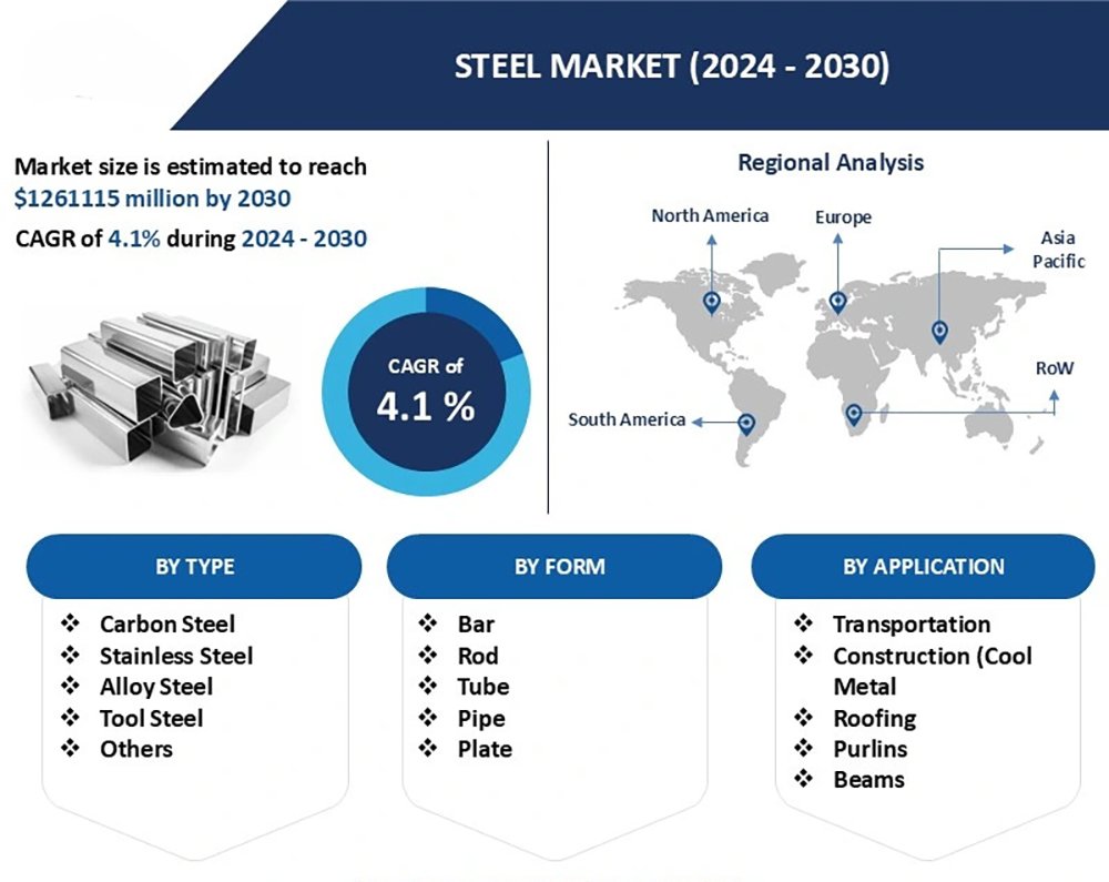 The steel market forecast for 2024–2030 highlights a sector that is set for steady but significant expansion, with the market size projected to reach over USD 1.26 trillion by 2030 at a CAGR of 4.1%. This growth reflects the dual pressure of rising global demand in infrastructure, transportation, and construction, alongside diversification into value-added applications such as roofing and engineered beams. Regionally, demand remains strongest in Asia-Pacific and Europe, though North and South America continue to represent critical growth pockets. Segmentation by type shows the dominance of carbon and stainless steels, while the product mix—bars, rods, tubes, and plates—mirrors the requirements of large-scale industrial projects. The analysis makes clear that steel remains a foundational material for global economic development, with steady regional growth ensuring both volume stability and innovation-driven opportunities across applications.